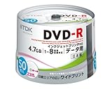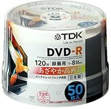TDK 録画用DVD-R ホワイトワイドプリンタブル 1-8倍速 日本製 スピンドル50枚パック DR120PWB50PU 価格: 1,759円 レビュー評価: 4.5 レビュー数:6 発色の良い白色のレーベル面いっぱいに美しい印刷が可能。ワイドプリント仕様の録画用DVD-R プリントエリアを通常の内径38mmから23mmまで広げた“ワイドプリント”仕様。インクジェットプリンタを使用して、中心部まで美しいレーベル印刷が楽しめる。なお、ディスクは日本製で、高速記録に対応した高精度基板や高感度 色素、高精度記録膜により、1〜8倍速記録において安定した特性を実現。大切な映像の長期保存に強い高信頼のディスクとなっている。 - インクジェットプリンタで内径23mmまで印刷できるワイドプリント仕様。レーベル面は、水性ペン・油性ペンでの手描